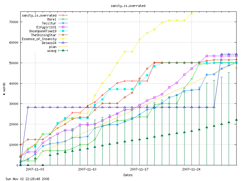 The NaNoWriMo wordcount graph for sanity.is.overrated and writing buddies.