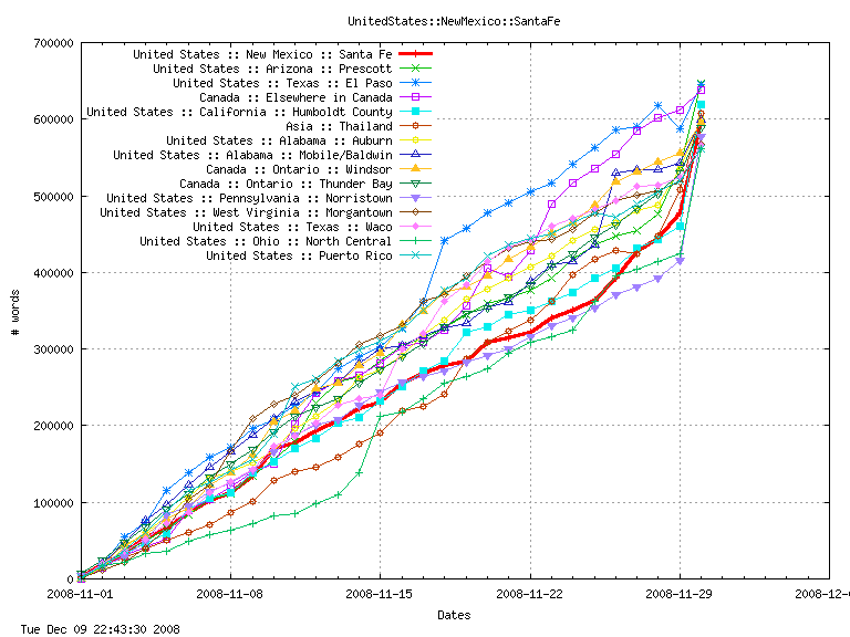 NaNoWriMo wcapi designed by Tim Yao (aka NewMexicoKid) and Russ Uman (firebus). Disclaimer: this is not an official NaNoWriMo site but instead is a service provided by NMK for NaperWriMo
